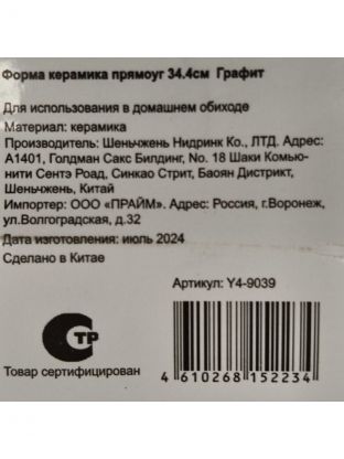 Форма для запекания керамика, 23.5х34.4х7 см, 2 л, прямоугольная, Графит, Y4-9039