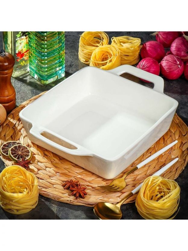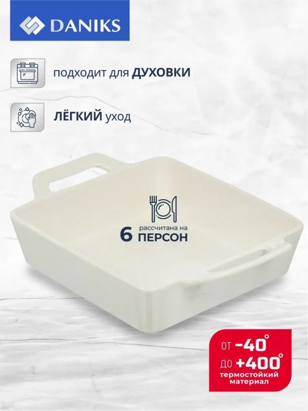 Чем отличается керамическая форма от металлической? Керамика лучше сохраняет тепло, не выделяет посторонних запахов и подходит для подачи блюда прямо на стол. Форма Daniks рассчитана на объем до 2,1 л, что удобно для семейных ужинов или приготовления еды на несколько дней. Отсутствие антипригарного покрытия позволяет использовать натуральные масла и сливочное масло по вкусу, а отсутствие крышки облегчает выпекание запеканок с румяной корочкой. Как использовать форму: просто уложите ингредиенты, поставьте в духовку или СВЧ, а после приготовления легко мойте под проточной водой.