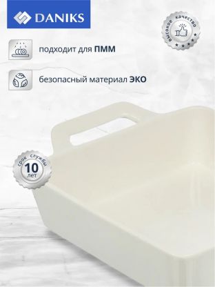 Форма для запекания Daniks Антарктида 2,1 л: идеальный выбор для вкусных домашних ужинов, подарка и дачи. Прочная керамика, универсальный размер, стильный белый цвет. Почему выбирают: Жаропрочная керамика сохраняет сочность и вкус блюд, устойчива к перепадам температур Универсальный размер 31,1х23,4х7,4 см — оптимально для запеканок, мяса, овощей и десертов Подходит для духовки и СВЧ, легко мыть, отличный вариант для дома, на дачу или в подарок Форма для запекания из керамики Daniks Антарктида — это современное решение для тех, кто ищет удобную, долговечную и эстетичную посуду для духовки и микроволновки. Керамический материал равномерно распределяет тепло, предотвращая пригорание, а белоснежный цвет стильно смотрится на столе. Если вы ищете, какую форму выбрать для запекания овощей или мяса, обратите внимание на прямоугольную форму — она удобна для порционной нарезки и экономит место в духовке. Чем отличается керамическая форма от металлической? Керамика лучше сохраняет тепло, не выделяет посторонних запахов и подходит для подачи блюда прямо на стол. Форма Daniks рассчитана на объем до 2,1 л, что удобно для семейных ужинов или приготовления еды на несколько дней. Отсутствие антипригарного покрытия позволяет использовать натуральные масла и сливочное масло по вкусу, а отсутствие крышки облегчает выпекание запеканок с румяной корочкой. Как использовать форму: просто уложите ингредиенты, поставьте в духовку или СВЧ, а после приготовления легко мойте под проточной водой. Форма Daniks Антарктида — выгодное решение для тех, кто ценит практичность, стиль и надежность. Оформите заказ сейчас, чтобы купить недорого форму для запекания для дачи, дома или подарка с гарантией качества и быстрой доставкой. Частые вопросы: Можно ли использовать форму Daniks Антарктида в микроволновке? Да, форма изготовлена из жаропрочной керамики и подходит для использования в СВЧ и духовке. Размеры позволяют разместить ее даже в компактных микроволновых печах. Чем выгодна керамическая форма для запекания? Керамика равномерно пропекает продукты, не впитывает запахи, легко моется и подходит для сервировки. Это универсальный вариант для дома, дачи и подарка. Какой объем и размеры у формы Daniks Антарктида? Объем формы — 2,1 л. Габариты: ширина 31,1 см, длина 23,4 см, высота 7,4 см. Прямоугольная форма без крышки и антипригарного покрытия. Дополнительная информация: Подходит для ПММ.