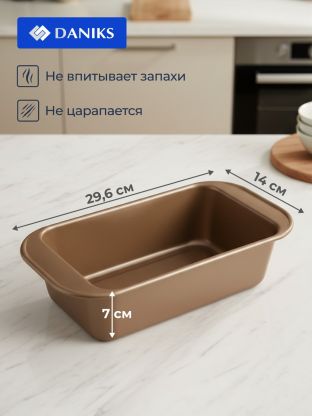 Форма для запекания сталь, 14х29.6х7 см, 1.2 л, антипригарное покрытие, прямоугольная, золотая, Daniks, KB19784