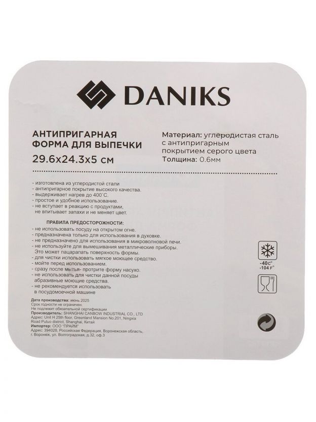 Многие спрашивают: «Как выбрать форму для запекания для духовки?» или «Что лучше для запекания мяса и овощей?» — квадратная стальная форма Daniks оптимальна для этих целей. В отличие от алюминиевых аналогов, сталь не подвержена деформации и обеспечивает равномерный прогрев. Покрытие облегчает уход, но мытье в посудомоечной машине не рекомендуется — это продлит срок службы изделия.
