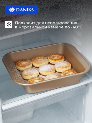 Если вы ищете, какую форму купить недорого для дачи или подарка, обратите внимание на универсальность: Daniks подходит для запекания курицы, рыбы, овощей, а также сладкой выпечки. Золотой цвет делает её стильным элементом сервировки.