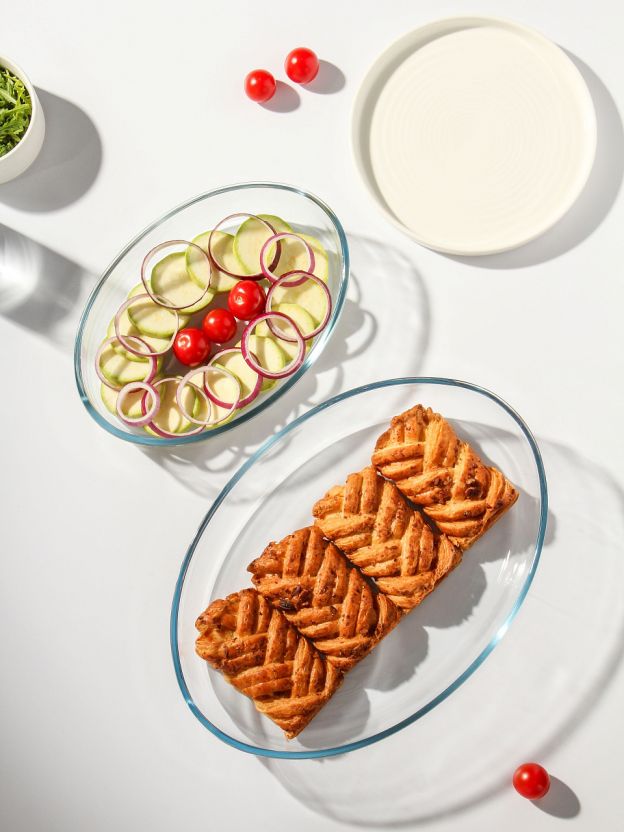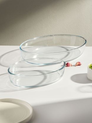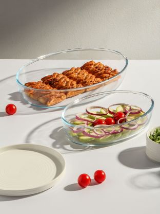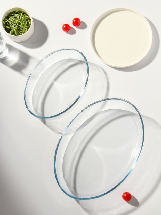 В наборе две овальные формы размером 24х35 см каждая, без крышки и антипригарного покрытия, из жаропрочного стекла.
