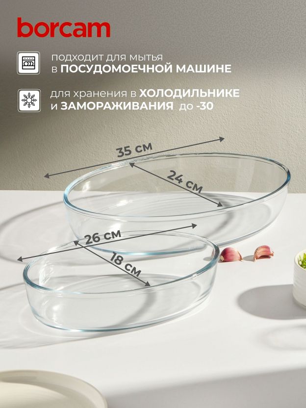 Форма для запекания Borcam: 2 овальные стеклянные формы 24х35 см — удобно готовить курицу, рыбу, пироги и подавать блюдо прямо на стол.