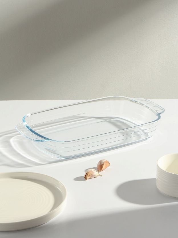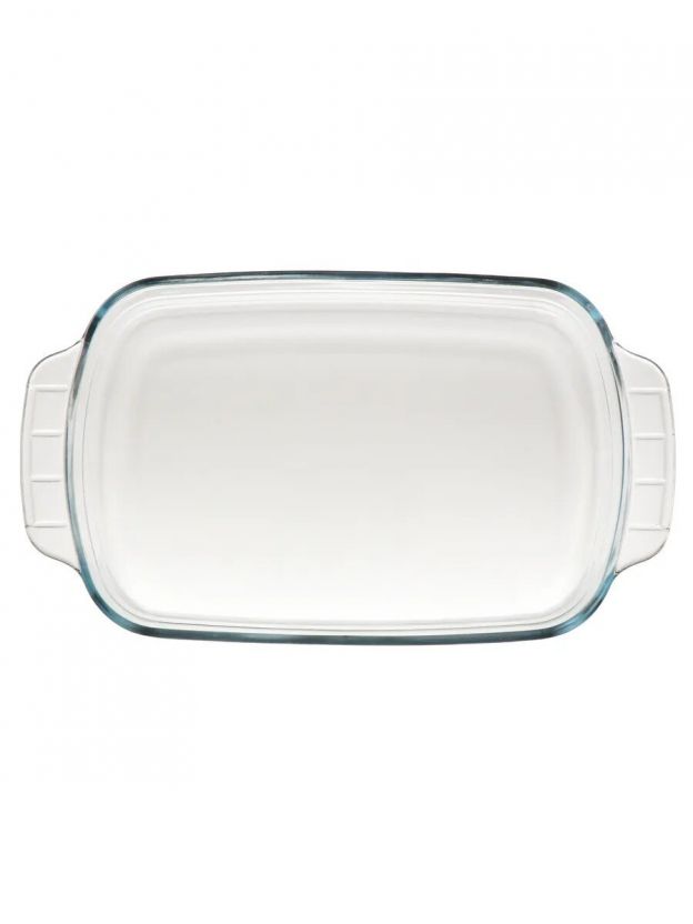 Объём — 2 литра, размеры: ширина 20.2 см, длина 34.5 см, высота 5.2 см. Прямоугольная форма без крышки, подходит для духовки и СВЧ.
