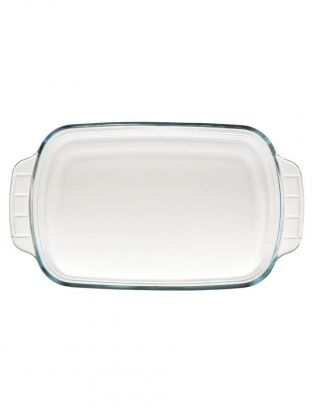 Объём — 2 литра, размеры: ширина 20.2 см, длина 34.5 см, высота 5.2 см. Прямоугольная форма без крышки, подходит для духовки и СВЧ.