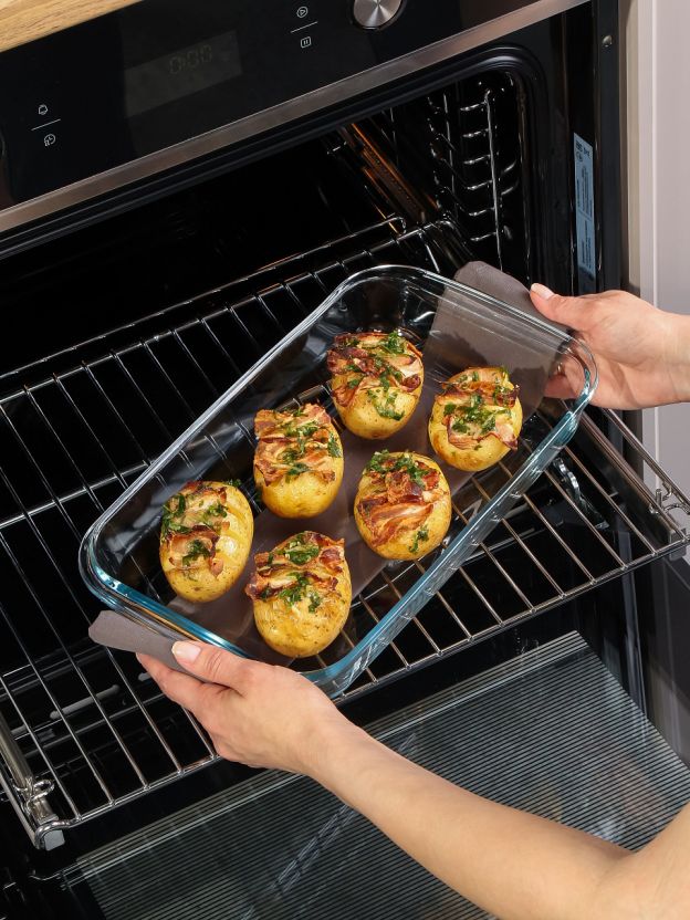 Стекло не впитывает запахи, не окрашивается, легко отмывается и подходит для хранения готовых блюд. Прозрачность позволяет контролировать процесс запекания.