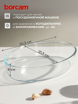 Овальная форма для запекания Borcam 2.36 л: жаропрочное стекло, оптимальный размер 21.3х30.3 см, подходит для духовки и СВЧ. Идеальный выбор для вкусных домашних блюд.