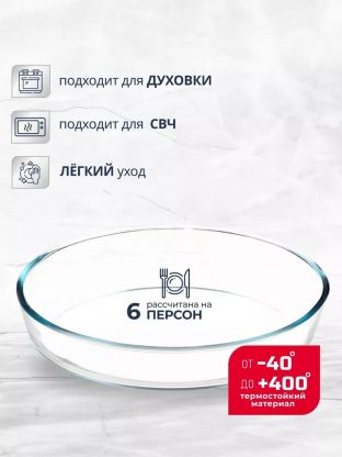 Объём — 2.4 литра, размеры: ширина 21.4 см, длина 29.8 см, высота 6.3 см. Овальная форма подходит для большинства стандартных рецептов.