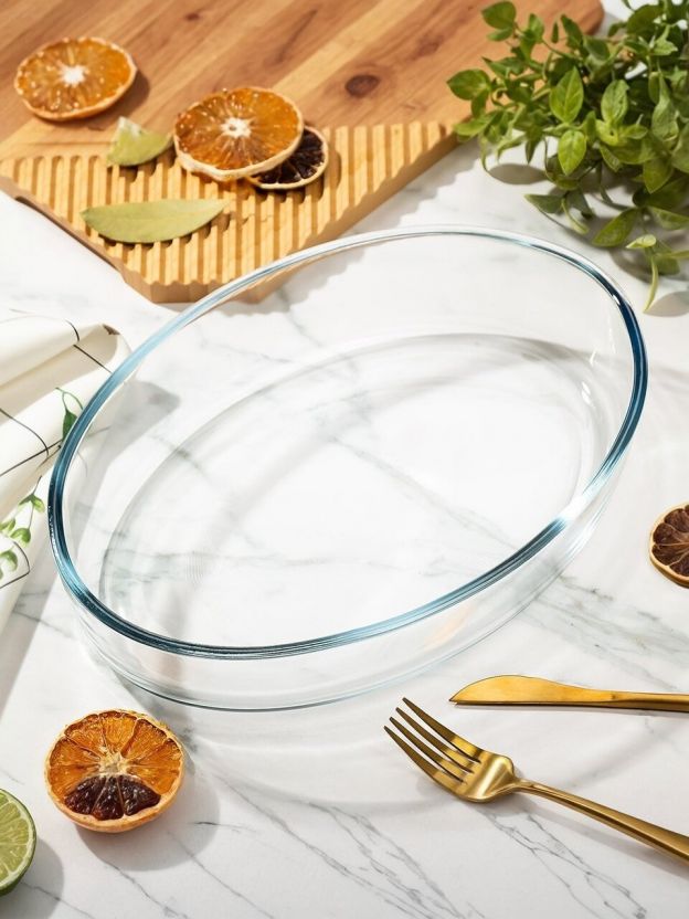 Объём — 2.4 литра, размеры: ширина 21.4 см, длина 29.8 см, высота 6.3 см. Овальная форма подходит для большинства стандартных рецептов.