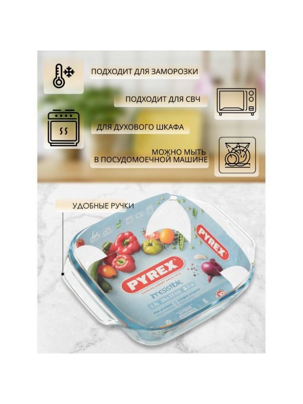 В отличие от металлических и керамических аналогов, жаропрочное стекло Pyrex не впитывает запахи и не окрашивается, его можно мыть в посудомоечной машине и использовать даже в СВЧ. Многие спрашивают: «Подходит ли эта форма для пирогов и запеканок?» — да, объём 2.3 литра и размеры 23х29 см позволяют готовить большие порции для всей семьи. Форму удобно использовать как дома, так и на даче или подарить ценителю домашней кухни.