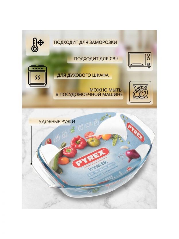 Форма для запекания Pyrex Classic 24х35 см, 2.8 л — жаропрочное стекло для духовки и СВЧ. Легко мыть, оптимальный размер для семьи, подходит для курицы, рыбы, пирогов. Почему выбирают: Оригинальное жаропрочное стекло Pyrex — не впитывает запахи и безопасно для здоровья Удобный овальный формат 24х35 см, вместимость 2.8 л — идеально для запекания больших блюд Универсальность: для дома, дачи, подарка; подходит для СВЧ, духовки, посудомойки Форма для запекания из жаропрочного стекла Pyrex Classic — это оптимальный выбор для тех, кто ищет надежную посуду для духовки и микроволновки. Благодаря высокопрочному стеклу, изделие не боится резких перепадов температур и сохраняет внешний вид даже после многократного использования. Овальная форма 24х35 см и объем 2.8 литра позволяют готовить целую курицу, рыбу или запеканки на семью из 3-5 человек. Если вы ищете, какую форму для запекания выбрать для дома или дачи, обратите внимание на эту модель: она не имеет антипригарного покрытия, поэтому не выделяет вредных веществ при нагреве. В отличие от металлических и керамических аналогов, стекло Pyrex не темнеет и не царапается, подходит для мытья в посудомоечной машине. Можно использовать в СВЧ и духовке — это удобно для быстрого разогрева и запекания без лишних хлопот. Как использовать форму для запекания Pyrex? Просто выложите ингредиенты, поставьте в духовку или микроволновку, а после — легко отмойте в посудомойке. Подходит ли форма для пирога, курицы или рыбы? Да, ее объем и размеры универсальны для большинства домашних рецептов. Оформите заказ на форму для запекания Pyrex Classic — получите оригинальную французскую посуду с доставкой. Надежное стекло, оптимальный размер и универсальность — выгодное решение для вашей кухни. Частые вопросы: Можно ли использовать форму Pyrex Classic в микроволновке и духовке? Да, форма выполнена из жаропрочного стекла, подходит для использования в СВЧ и духовках любых типов. Не рекомендуется ставить на открытый огонь. Чем выгодна стеклянная форма для запекания по сравнению с металлической или керамической? Стекло Pyrex не впитывает запахи и не выделяет вредных веществ, легко моется, не царапается, не темнеет, подходит для мытья в посудомойке и не требует специальных антипригарных покрытий. Какой объем и размеры у формы Pyrex Classic 411B000/7046? Объем — 2.8 литра, размеры — 24x35 см, овальная форма. Это удобно для приготовления блюд на 3-5 человек.