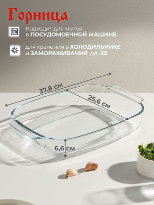 Прямоугольная форма для запекания из жаропрочного стекла 3,7 л Горница — идеальный выбор для семьи: удобно готовить мясо, рыбу и пироги, легко мыть, подходит для микроволновки и духовки.