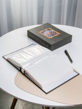 Альбом изготовлен из плотного картона с ламинированной обложкой, что обеспечивает дополнительную защиту от влаги и пыли.