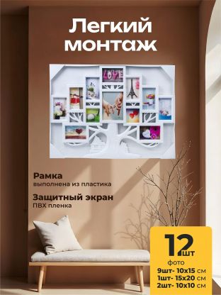 Фоторамка-коллаж на 12 фото, 58х81 см, пластик, 9 фото 10х15 см, 1 фото 15х20 см, 2 фото 10х10 см, Y4-3884