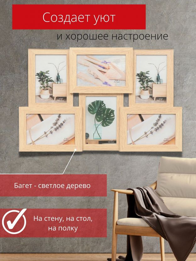 Фоторамка-коллаж на 6 фото, 29.5х47 см, светлый дуб, Y3-1556