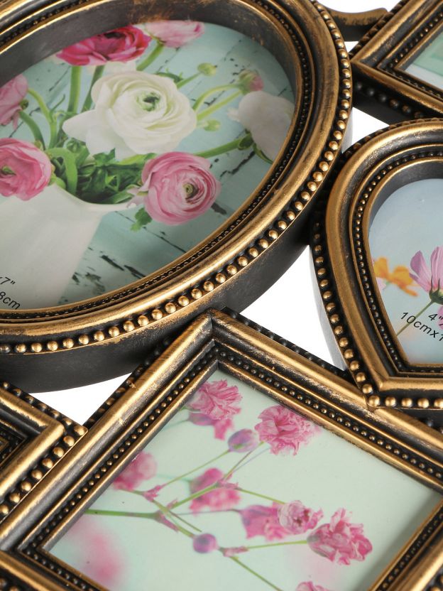 В фоторамке размещается 6 снимков стандартного размера (обычно 10х15 см или 9х13 см). Общий размер изделия — 40х42 см.