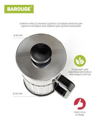 Френч-пресс, благодаря своим прозрачным стенкам, позволяет наблюдать за завораживающим процессом заваривания кофе, создавая неповторимую атмосферу уюта на вашей кухне. Материалы данного аксессуара не впитывают посторонние запахи, а также сохраняют первозданный вкус и аромат вашего напитка. Удобное использование и высокая стойкость к механическим воздействиям делают френч-пресс незаменимым кухонным помощником, с которым вы в любое время сможете насладиться любимым напитком.