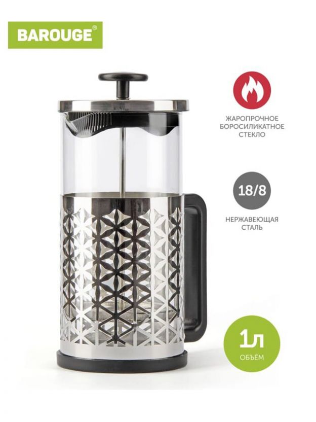 Френч-пресс 1 л, стекло, Barouge, Traditional choice, серебро, BF-705