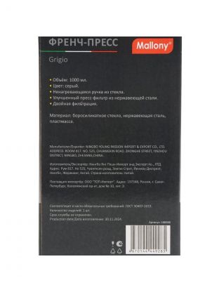 Закажите френч-пресс Mallony Grigio — получите быструю доставку, гарантию оригинальности и наслаждайтесь любимыми напитками дома, на даче или в офисе.