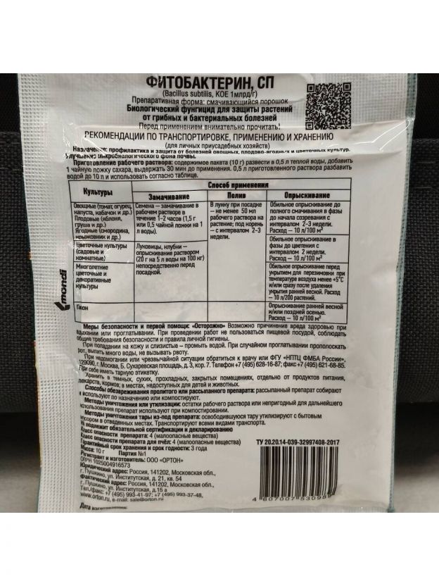 Приготовление рабочего раствора: содержимое пакеты (10 г) развести в 0,5 л теплой воды, добавить 1 чайную ложку сахара, выдержать 30 мин до применения. 0,5 л приготовленного раствора разбавить водой до 5 л и использовать.