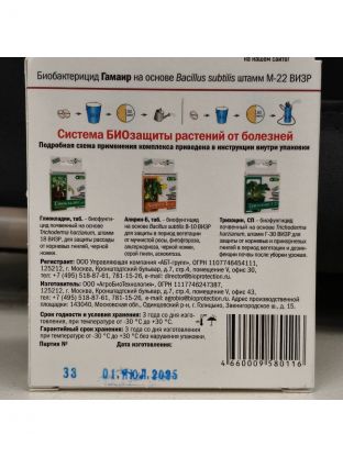 Гамаир - биологический бактерицид на основе природной бактерии Bacillus subtilis М - 22 ВИЗР, предотвращающий пятнистости на листьях, бактериальные гнили, паршу, монилиоз, бактериальный рак, сосудистый и слизистый бактериозы.