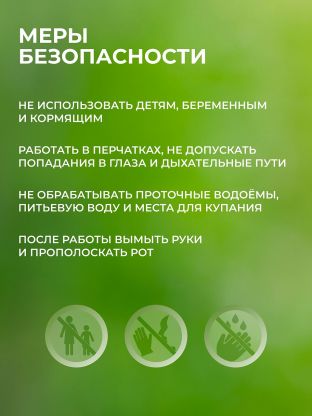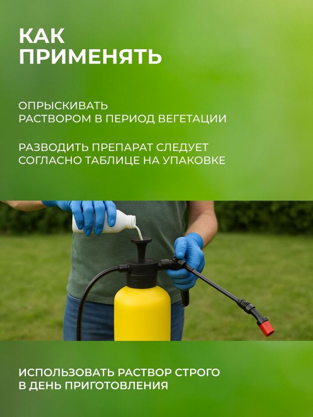 Опрыскивание рабочей жидкостью в период вегетации. Для приготовления рабочего раствора в резервуар налить 1 литр воды, добавить необходимое количество препарата и тщательно перемешать. Далее долить воду до необходимого объема и еще раз перемешать. Рабочая жидкость должна быть использована в день приготовления.