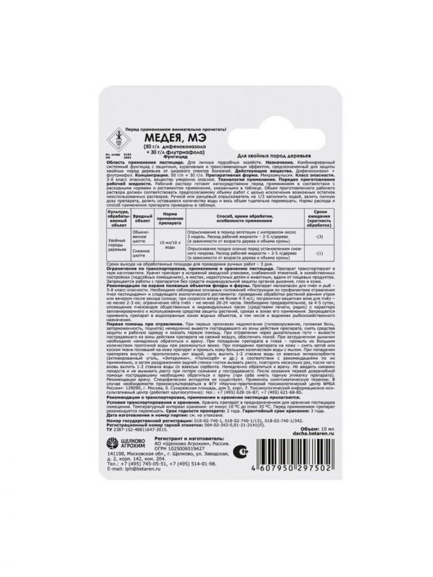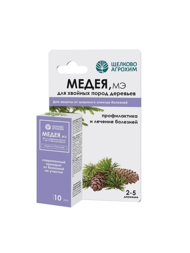 Фунгицид Медея — надежное решение для защиты хвойных растений от различных заболеваний. Этот продукт от бренда Щелково Агрохим специально разработан для борьбы с паршой, мучнистой росой, плодовой гнилью, плесенью, оидиумом и серой гнилью. Жидкая форма выпуска обеспечивает легкость в применении, а объем 10 мл делает его удобным для использования в саду.