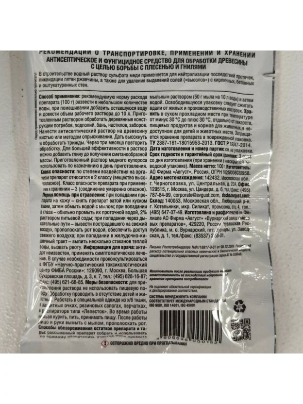 Фунгицид Медный купорос, от плесени и гнилей древесины, 100 г, Avgust