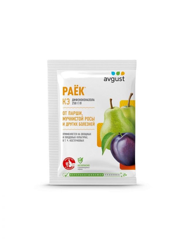 Благодаря системному действию средство быстро проникает в ткани растений, в которых зимовали возбудители болезней. «Раёк» может не только предотвратить размножение патогена, но и ослабить заражение, если первые симптомы уже проявились. Уже через 2 часа после использования препарат не смывается дождем, что очень важно весной, когда проводится первая обработка. Всего необходимо 4 обработки за сезон.