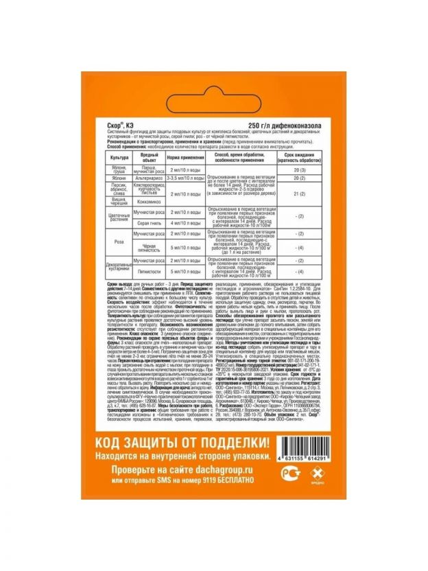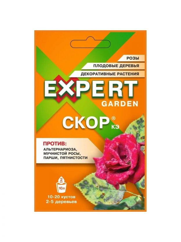 Скор - системный фунгицид с длительным профилактическим и выраженным лечебным действием предназначен для защиты плодовых культур от болезней, цветочных растений и декоративных кустарников – от мучнистой росы, серой гнили; роз – от чёрной пятнистости.