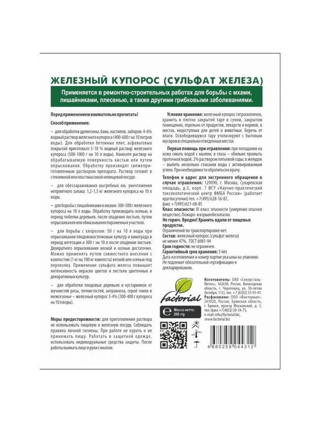 Фунгицид Железный купорос Agros — эффективное решение для защиты плодово-ягодных и декоративных культур от мха, лишайника, плесени и грибковых заболеваний. Препарат в форме порошка идеально подходит для опрыскивания, предотвращая появление гнили и плесени на древесине. Удобная фасовка 200 г обеспечивает экономичный расход. Покупка позволит сохранить здоровье растений и повысить урожайность, что особенно важно для дачи и сада.