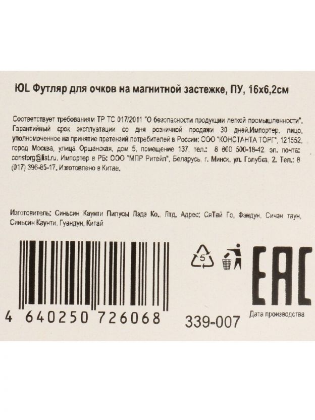 Футляр для очков 16х6.2х4.3 см, полиуретан, ЮниLook, 339-007, прямоугольный, магнитная застежка, в ассортименте