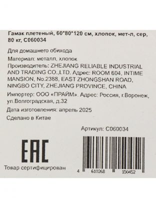 Гамак плетеный, 60х80х120 см, хлопок, металл, серый, 80 кг, C060034