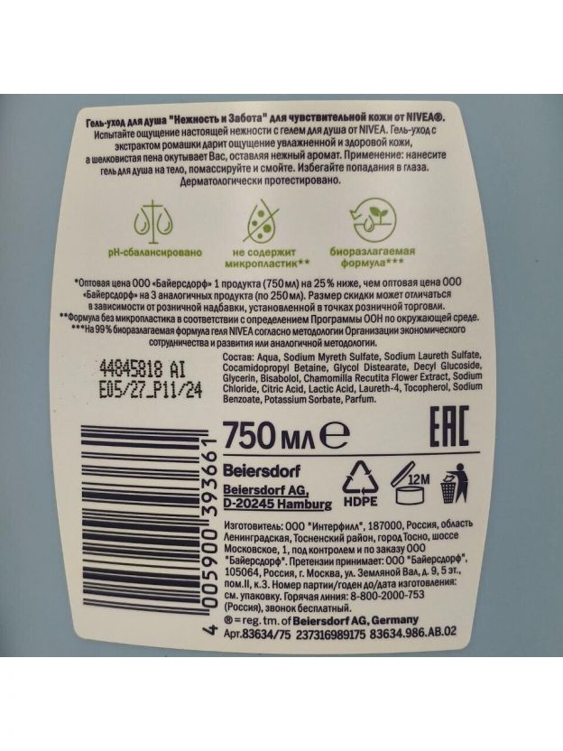 Гель для душа Nivea, Нежность и Забота, 750 мл
