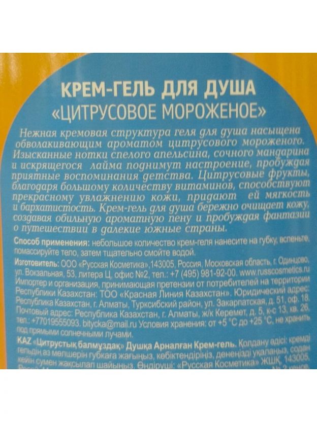 Нежная кремовая структура геля для душа насыщена обволакивающим ароматом цитрусового мороженого. Изысканные нотки спелого апельсина, сочного мандарина и искрящегося лайма поднимут настроение, пробуждая приятные воспоминания детства.