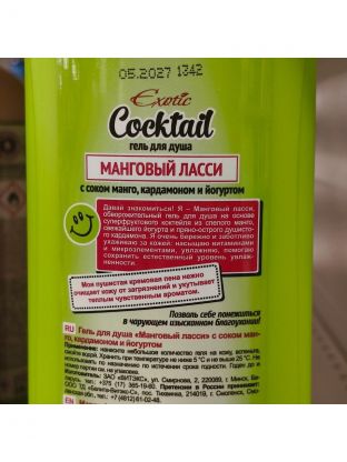 Состав: вода, лауретсульфат натрия, кокамидопропилбетаин, кокамид ДЭА, хлорид натрия, децилглюкозид, ПЭГ-7 глицерилкокоат, поликватерниум-7, сополимер стирола и акрилатов натрия, парфюмерная композиция, лимонная кислота, ЭДТА динатрия, бензиловый спирт, метилхлоризотиазолинон, метилизотиазолинон, йогурт, фруктовый сок, ПЭГ-40 гидрогенизированное касторовое масло, тридецет-9, экстракт семян Elettaria Cardamomum (кардамона), CI 19140, CI 19140, CI 42090.