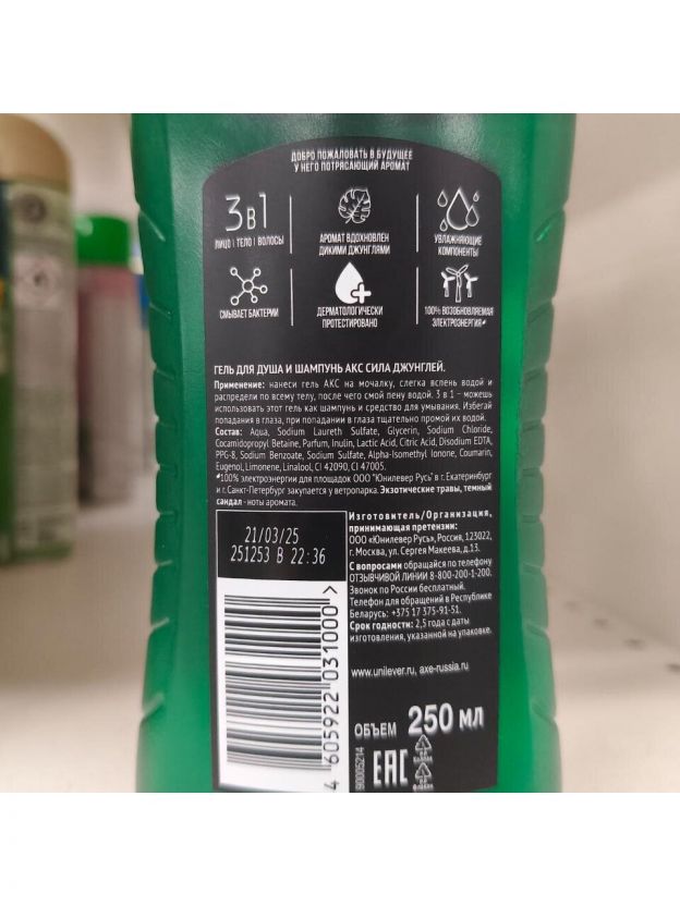 Гель для душа и шампунь Axe, Сила джунглей, для мужчин, 250 мл