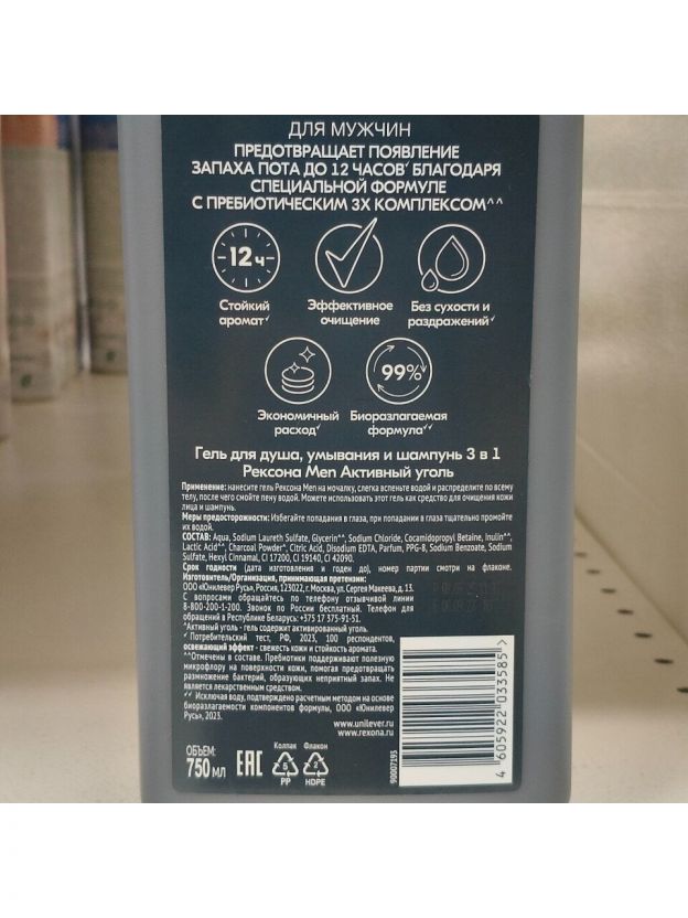 Гель для душа и шампунь Rexona, 3 в 1 Активный уголь, для мужчин, 750 мл