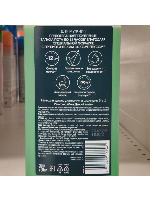 Гель для душа и шампунь Rexona, 3 в 1 Дикий лайм, для мужчин, 750 мл