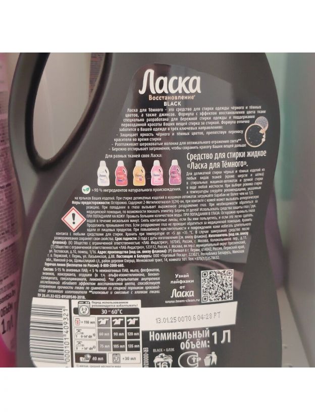 Жидкий порошок Ласка Восстановление BLACK для тёмного эффективно и бережно отстирывает загрязнения на одежде, восстанавливая яркость чёрного и тёмных цветов и сохраняя прочность волокон ткани. В отличие от обычного порошка, Ласка содержит цветозащитные ингредиенты, которые поддерживают стойкость цвета одежды. Активные компоненты способствуют уменьшению количества катышков на ткани. Формула содержит более 90% ингредиентов натурального происхождения. Преимущества: Бережно и эффективно отстирывает загрязнения. Восстанавливает и защищает яркость цвета. Сохраняет форму ткани и препятствует появлению катышков. Не оставляет разводов. Гель Ласка удобен в использовании: дозируйте жидкое средство согласно инструкции, заливайте его в отделение для стирального порошка или добавьте мерный колпачок со средством в барабан стиральной машины. Предназначен для стирки чёрных и тёмных изделий из любых видов ткани (кроме шерсти и шёлка) в стиральных машинах-автоматах и ручной стирки в воде любой жёсткости. Рекомендации: При выборе режима стирки и температуры следуйте рекомендациям, указанным на ярлыках Ваших изделий. При стирке деликатных изделий в машинах-автоматах загружайте барабан не более чем на 1/2. Стиральное средство Ласка просто использовать. Благодаря удобной крышке-дозатору Вы всегда будете знать, сколько геля необходимо добавить в отделение средств для стирки в стиральной машине или в воду при ручной стирке. Информация по дозировке стирального средства указана на обратной стороне упаковки. Состав: 5-15 % анионных ПАВ; 5 % неионогенных ПАВ, мыла, фосфонатов, энзимов, консерванта, отдушки (в т.ч. гексилциннамаля, цитронеллола, амилциннамаля, лимонена), красителя. Условия хранения: Хранить при температуре от +5 до +35 °C. Цвет геля может варьироваться от молочного до светло-фиолетового.