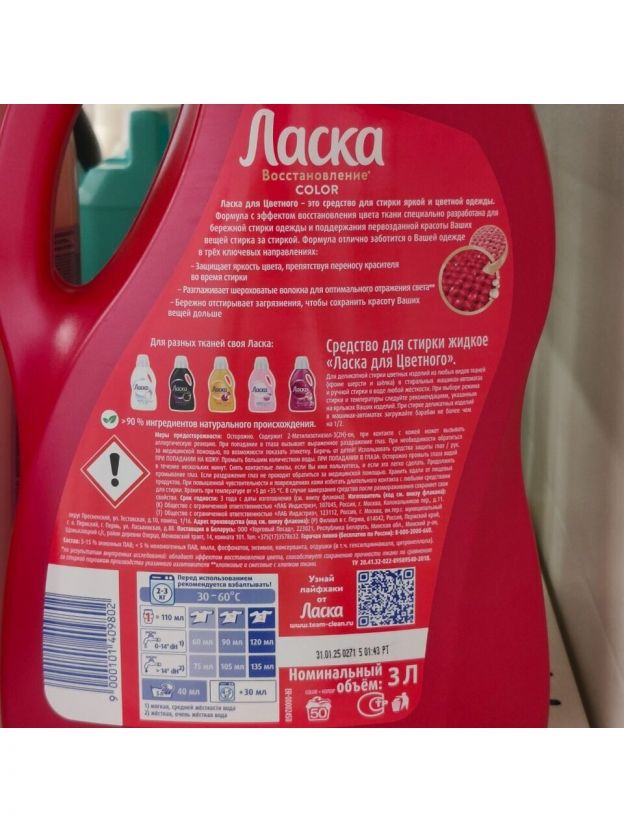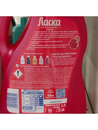 Жидкий порошок Ласка "Восстановление для цветного" эффективно и бережно отстирывает загрязнения на одежде и белье, восстанавливая яркость цвета и сохраняя прочность волокон ткани. В отличие от обычного стирального порошка, Ласка содержит специальные цветозащитные ингредиенты, которые поддерживают первозданную красоту и обеспечивают стойкость цвета вашей одежды. Уникальные технологии и активные компоненты способствуют уменьшению количества катышков на ткани. В результате регулярного использования средства для стирки Ласка поверхность ткани становится более гладкой. Формула содержит более 90% ингредиентов натурального происхождения. Подходит для любых видов ткани (кроме шерсти и шёлка).