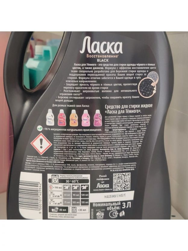 Жидкий порошок Ласка "Восстановление для тёмного" эффективно и бережно отстирывает загрязнения на одежде и белье, восстанавливая яркость чёрного и тёмных цветов и сохраняя прочность волокон ткани. В отличие от обычного стирального порошка, Ласка содержит специальные цветозащитные ингредиенты, которые поддерживают первозданную красоту и обеспечивают стойкость цвета вашей одежды. Уникальные технологии и активные компоненты способствуют уменьшению количества катышков на ткани.