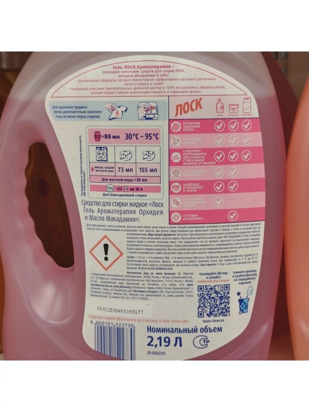Жидкие средства для стирки Лоск Ароматерапия Орхидея и Масло Макадамии – последнее поколение средств для стирки Лоск, которые подходят для стирки белых и цветных вещей. Гель для стирки Лоск Ароматерапия Орхидея и Масло Макадамии: Эффективно удаляет различные пятна. Обладает уникальным сочетанием притягательных ароматов цветов и 100% натуральных эфирных масел, которое подарит вещам длительную свежесть и чарующий аромат. Подходит для всех типов тканей, кроме шерсти и шелка. Обеспечивают щадящее отношение к ткани во время стирки. Растворяется даже в холодной воде и при стирке на коротких циклах. Не оставляет разводов и полностью выполаскивается водой. Не пылит, не просыпается и не накапливается в кювете стиральной машины. Для стирки всех типов тканей, кроме шерсти и шелка. Рекомендации: Используя колпачок, налейте средство в отсек для стиральных порошков согласно рекомендуемой дозировке. Следуйте рекомендациям на ярлыках одежды и в паспорте стиральной машины при выборе режима стирки и температуры. Белое белье стирайте отдельно от цветного. Для удаления трудных пятен дополнительно нанесите гель на пятно перед стиркой. Возможно использовать для ручной стирки. При ручной стирке полностью растворите средство в воде, после стирки несколько раз прополощите белье в теплой, а затем в холодной воде. Состав: 5-15% аннионных ПАВ, 5% неионогенных ПАВ, мыла, фосфонатов, энзимов, консерванта, отдушки (в т.ч. бензилсалицилата), красителя. Условия хранения: Хранить, защищая от прямых солнечных лучей, при температуре от +5 до +35 °С.