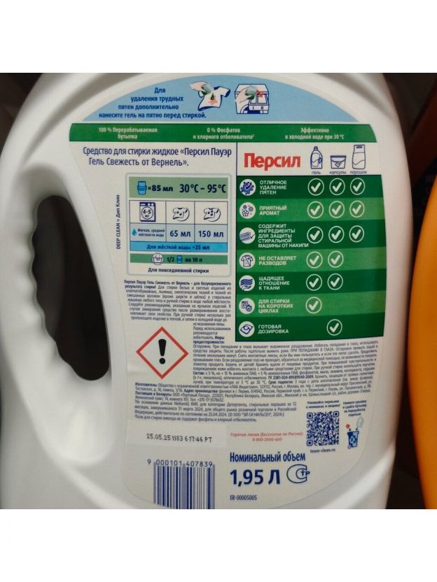 Жидкое средство для стирки Персил подарит вещам сияющую чистоту и свежесть. Гель содержит активную формулу Deep Clean Plus с 13 компонентами, которая обеспечивает непревзойденный результат стирки. Характеристики: Объем: 1.95 л. Назначение: для белого белья. Состав: 5–15 % анионных ПАВ, 5 % неионогенных ПАВ, фосфонаты, мыло, энзимы, консерванты, отдушки (в т.ч. лимонена), краситель, оптический отбеливатель. Преимущества: Сохраняет первозданную чистоту и яркость белых вещей. Глубоко проникает в волокна ткани и отстирывает даже самые сложные пятна. Дарит вещам свежий аромат, который сохраняется надолго. Подходит для всех типов тканей, кроме шерсти и шелка. Обеспечивают щадящее отношение к ткани во время стирки. Растворяется даже в холодной воде и при стирке на коротких циклах. Не оставляет разводов и полностью выполаскивается водой. Не пылит, не просыпается и не накапливается в кювете стиральной машины. Гель обеспечивает максимально эффективное удаление пятен и загрязнений с белого белья, сохраняя его яркость и белизну на длительный период времени. А благодаря свежему аромату от Вернель ваше белье будет приятно пахнуть и выглядеть как новое после каждой стирки.