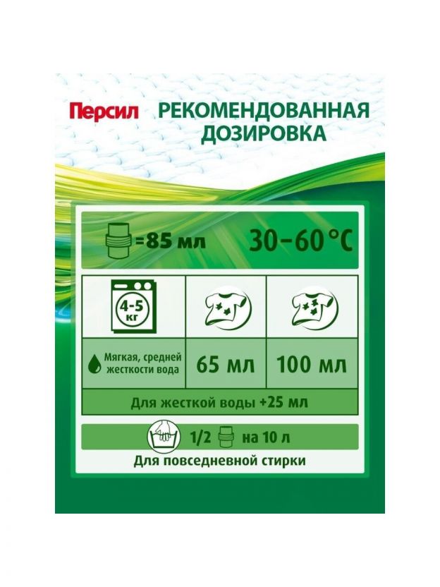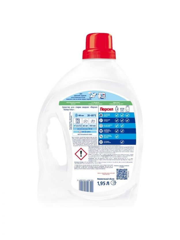 Гель для стирки Персил Color предназначен для стирки цветных изделий из хлопчатобумажных, льняных, синтетических тканей и тканей из смешанных волокон (кроме шерсти и шелка) в стиральных машинах-автоматах и ручной стирки в воде любой жесткости. Состав: 5-15 % анионных ПАВ; Характеристики: Тип: гель для стирки; Объем: 1,95 л; Особенность: концентрат; Вид упаковки: бутылка. Преимущества: Cохраняет яркость цветного белья. Справляется с различными видами пятен. Дарит вещам свежий аромат. Подходит для всех типов тканей, кроме шерсти и шелка. Растворяется даже в холодной воде и при стирке на коротких циклах. Не оставляет разводов и полностью выполаскивается водой. Не пылит, не просыпается и не накапливается в кювете стиральной машины. Обеспечивают щадящее отношение к ткани во время стирки.
