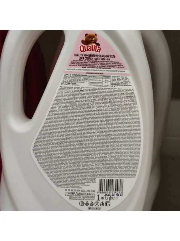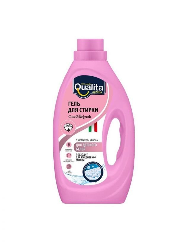 Гель для стирки Qualita 1 л: безопасная забота о детском белье без фосфатов, свежесть и чистота с первой стирки. Подходит для машинной и ручной стирки. Почему выбирают: Безопасен для малышей — не содержит фосфатов, подходит для чувствительной кожи детей с первых дней жизни; Экономичный формат — 1 литр геля в удобной бутылке или канистре, расходуется медленно даже при ежедневном использовании; Универсальность — эффективно очищает детское бельё дома, на даче и в поездках, подходит для подарка молодой маме. Гель для стирки Qualita специально создан для бережной и эффективной очистки детского белья. Благодаря отсутствию фосфатов и гипоаллергенной формуле, он идеально подходит для новорождённых и детей с чувствительной кожей. Если вы ищете, какой гель для стирки лучше выбрать для детских вещей, обратите внимание на Qualita — он обеспечивает деликатный уход, не оставляет следов и легко выполаскивается. В отличие от порошков и агрессивных средств, гель Qualita не вызывает раздражения, подходит для машинной и ручной стирки, а лёгкий аромат свежести не перебивает натуральный запах тканей. Многие спрашивают: подходит ли этот гель для стирки на даче или в поездке? Да, компактная упаковка и универсальность использования делают его удобным решением для любых условий. Если сравнивать с аналогами, Qualita выгодно отличается отсутствием агрессивных добавок и простотой применения. Выбирайте гель для стирки Qualita, чтобы купить недорого безопасное и эффективное средство для детского белья с доставкой. Оформите заказ — заботьтесь о здоровье малышей с уверенностью в чистоте! Частые вопросы: Можно ли использовать гель Qualita для стирки новорождённых? Да, гель не содержит фосфатов и раздражающих веществ, подходит для стирки одежды новорождённых и малышей с чувствительной кожей. Чем гель Qualita лучше порошка для детской стирки? Он полностью выполаскивается, не оставляет следов и не вызывает аллергию, подходит для всех типов стирки и не требует дополнительных ополаскивателей. Какой объём упаковки у геля Qualita и как долго он расходуется? Объём — 1 литр; экономичный расход позволяет использовать одну упаковку до 20–25 стирок, в зависимости от степени загрязнения белья.