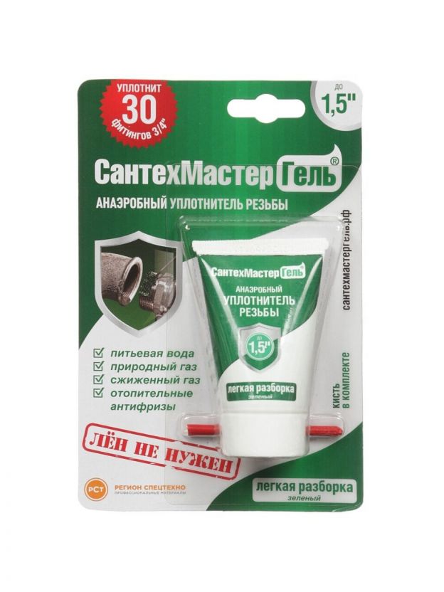 Анаэробный уплотнитель СантехМастерГель Зелёный — гель-герметик предназначенный для уплотнения резьбовых и фланцевых металлических соединений диаметром до 1,5 дюймов. Надежно герметизирует резьбу, полученное соединение устойчиво к различным средам, высокому давлению и вибрациям, обеспечивает защиту резьбы от коррозии. Полимеризация геля происходит внутри резьбы, в отсутствии кислорода. Продукт имеет СЭЗ на применение в системах с горячей и холодной питьевой водой.
