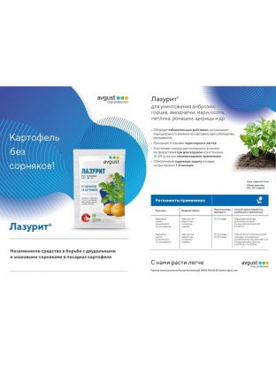 Ищете эффективное средство для борьбы с сорняками на картофеле? Гербицид Лазурит от бренда Avgust — идеальное решение! Это специализированное средство от сорняков, которое подавляет проростки сорняков в почве, обеспечивая здоровый рост картофеля.