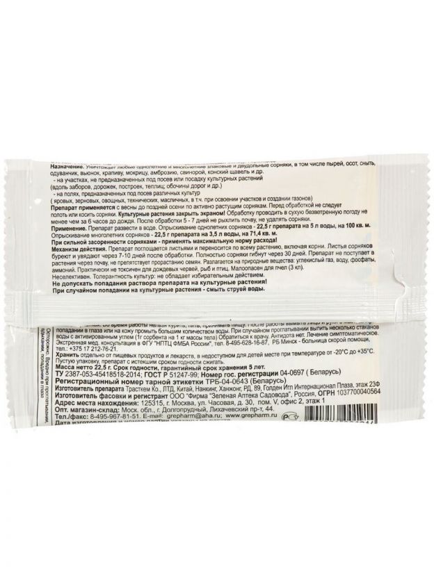 • Эффективность: гербицид сплошного действия уничтожает широкий спектр сорных растений, включая двудольные и наиболее устойчивые виды.